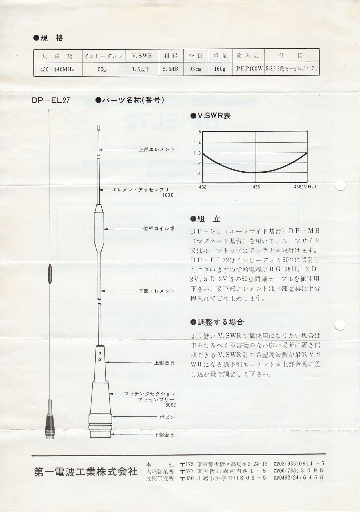 No.UA-150 DP-EL72 430MHz 5/8λ 2段 モービル用 ANT 第一電波工業